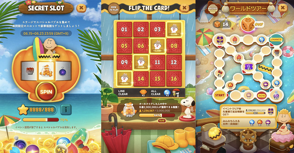 在活動期間內,特別泡泡老虎機活動,特別泡泡會出現在地圖上有顯示旗幟標示的關卡內,消除並蒐集到指定數量的特別泡泡後,即可轉動神秘老虎機並隨機獲得限定寵物「Surfboard Charlie Brown(SS)」以及遊戲內豪華道具喔!【活動期間】台灣時間 2021年6月21日(一)10:00~2021年6月25日(五)22:59。卡片賓果,以賓果遊戲方式進行,點選覆蓋的卡片進入活動關卡,翻到幸運卡片時,可以在過關後獲得幸運卡片獎勵。通關全部關卡把卡片都翻開後,便可以獲得「Umbrella Charlie Brown & Snoopy(SS)」喔!【活動期間】台灣時間2021年6月25日(五)10:00~2021年6月30日(三)22:59。世界之旅,只要通過一般關卡,即可獲得擲骰子的機會,在世界之旅活動頁面中擲骰子前進並完成環遊世界一周,就能獲的「Beach Sally(S)」以及遊戲內豪華道具喔!【活動期間】台灣時間 2021年7月1日(四)10:00~2021年7月6日(二)22:59。