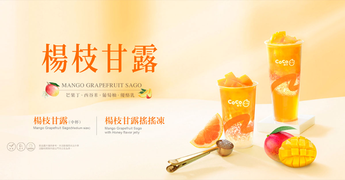 楊枝甘露系列飲品靈魂主角就是擁有濃郁果香的當季芒果外還搭配酸甜多汁的紅柚果肉,Q彈的西米露。最為特別的是,CoCo竟是使用優酪乳取代楊枝甘露常用的椰奶。優酪乳內含的益生菌更幫助消化順暢,這樣創新搭配不僅保持了楊枝甘露原有的香醇口感,酸甜的口感更是讓不少嘗試過的民眾印象深刻。然而升級版的「楊枝甘露搖搖凍」加入了CoCo特有「蜜香凍」配料,Q彈爽口的蜜香凍搭配酸甜的楊枝甘露,更是增添了咀嚼口感,讓人一口接一口停不下來。