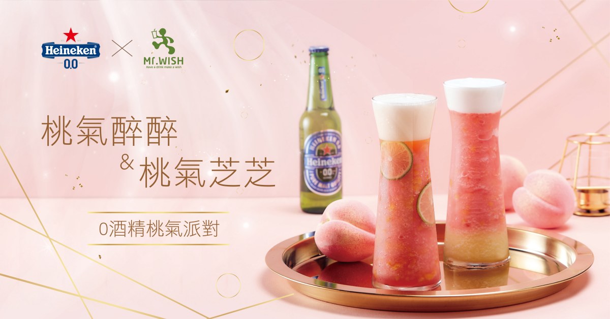 人氣手搖飲Mr.Wish鮮果茶玩家與海尼根聯名合作推出「桃氣醉醉」飲品,以蜜桃冰沙加上0.0酒精海尼根,蜜桃清爽果香與0酒精啤酒完美結合,這款創意調飲口感清爽,讓你無論任何時刻都能自在暢飲!4/15-5/2的每週五、六、日於Mr.Wish門市舉辦0酒精桃氣派對,凡購買「桃氣醉醉、桃氣芝芝」任2杯,就免費送「海尼根0.0零酒精啤酒」乙瓶(330ml),數量有限,贈完為止!週末快來Mr.Wish開喝0酒精創意蜜桃飲品!