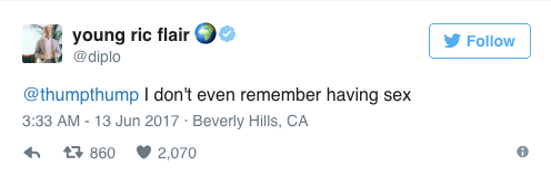 可能發現自己會造成話題,Diplo隨即把推文刪除。不過,又推了一篇「很高興我贏得性愛奧運的銅牌。」(I won the bronze metal in sex Olympics)雖然這段「得獎感言」看起來禮貌而優雅,卻還是感覺到他並不想得這塊銅牌。(白話一點就是不想輸給奧蘭多和約翰)(男生誰會希望被比下去)