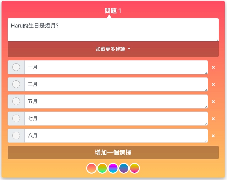 一開始只要先輸入自己的所在地&名字就能開始設計題目,一開始的題目為「你的生日是幾月」,下方可以直接填答,如果沒有對應的選項,也可以按「增加一個選擇」輸入選項或按X刪除選項