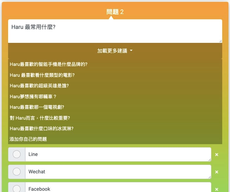 問題2來到「你最常用什麼(社交軟體)」,不喜歡題目的話可以在問題框框中按下「加載更多建議」,就會出現如你最喜歡的智能手機品牌、最喜歡看什麼類型的電影、夢想擁有哪輛車等預設問題與相對的答案選項。還是不滿意的話可以按「添加你自己的問題」來自訂題目(像妞編輯就都不喜歡這些題目XD),另外每一題也可以設定顏色,但選項不多就是了,鮮豔的漸層色很有IG icon的感覺。