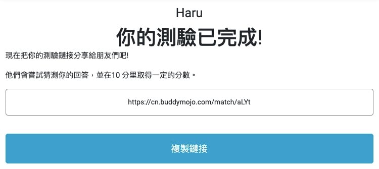 設計完題目會自動生成一個連結,傳給朋友後可以開始友情測試啦(誤)。網路上這種「友情測驗」其實蠻多的,這次介紹BuddyMojo設計的好友挑戰,特別的點在於可以自訂題目,不會受制於原本系統預設,自由度很高妞編輯建議前面3個題目可以出簡單一點,後面再慢慢變難,增加挑戰感(笑),妞妞們快設計自己的題目讓朋友玩玩看吧~(其實要出關於自己的10道題也蠻難的耶XD)