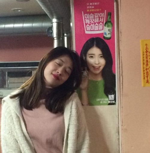 和IU私交甚篤的雪莉放上與IU燒酒海報的合影。