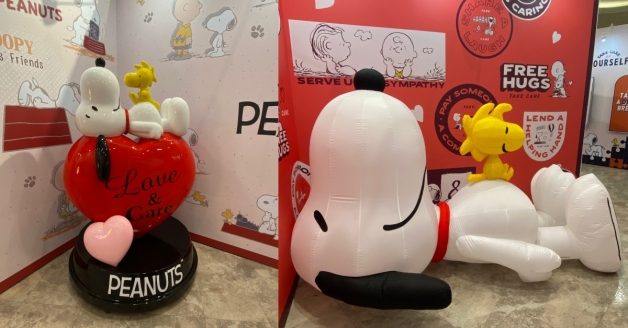 「PEANUTS™花生漫畫關愛巡迴展」特別在入口處放上巨型的「史努比」和「胡士托」充氣公仔,可見史努比懶懶地躺著與胡士托對視微笑,背板處「Take Care」也呼應這次的「關愛」主題,同時展區還以三大理念為主軸設計標語!