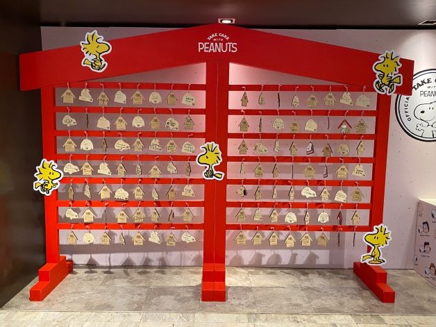 本次展覽第一大亮點「關愛祝福牆」,特別以日本神社繪馬架做為造型,妞妞們可以拿取「史努比」或「胡士托」造型的繪馬,在上頭寫上告白或心願並掛在牆上!
