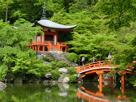 醍醐山原本就是賞櫻勝地,但褪去了粉色櫻花後,在這優美的世界遺產中也能欣賞到壯闊的青楓呦〜在寺廟的四周,都被剛萌發新芽的綠色枝頭所圍繞,特別迷人。尤其是那倒映在弁天池的青楓,和朱紅色的弁天堂相映成趣,是必看的觀賞點。