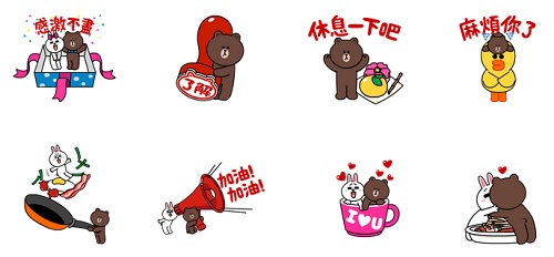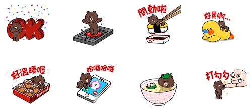 這次的貼圖總共有24張,熊大化身成為拇指姑娘般的大小,出現在章魚燒、手機螢幕上,最可愛的是他居然還趴在握壽司上,只要大喊一聲「開動啦!」就可以把熊大給吃掉~