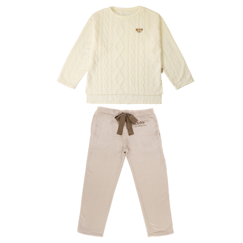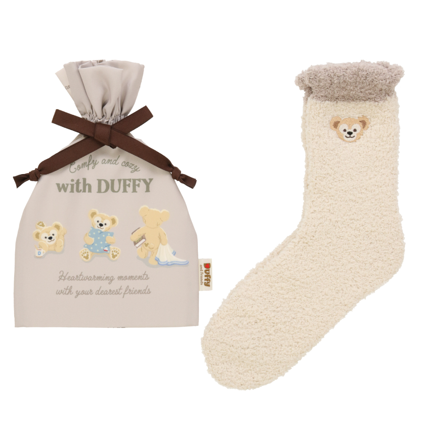 隨著充滿涼意的秋天即將到來,東京迪士尼也推出適合秋冬穿著的可可色居家服!上衣除了胸前的「達菲刺繡」外,手軸的部分更設計了可愛的「腳印」,而下身也擁有質感大加分的絲質綁帶和字繡。柔軟的毛絨襪子上頭也展示了達菲可愛的臉龐,附帶的束口袋更是實用性十足!