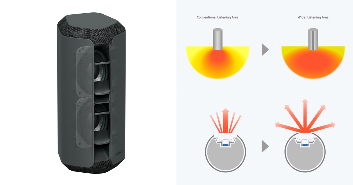 Sony X系列可攜式無線藍牙喇叭SRS-XE300 / XE200全新搭載線性擴散器,透過特殊結構將聲音聚集狹窄的隙孔中以提升聲壓,讓揚聲器將音源透過均勻的能量傳遞得更遠更廣,在同一空間中的任何角落都能享受最優異的聲音效果。