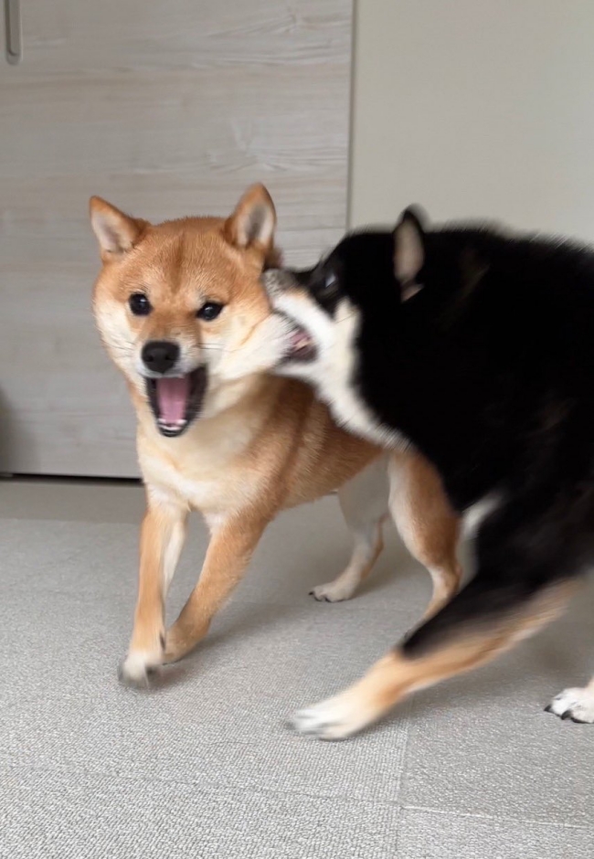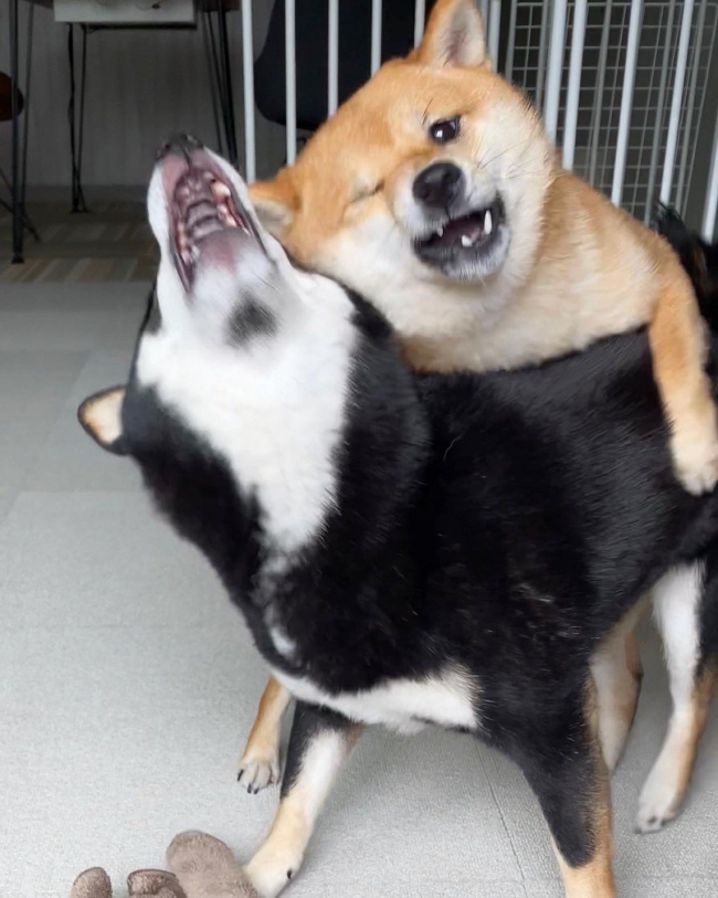 網友「@AsaMameshiba」經常在推特分享自家兩隻柴柴的日常生活,其中黑色的柴犬姐姐名叫「小朝(あさ)」,而赤柴妹妹則是「小儂(のん)」,兩隻柴柴的感情相當好,但家裡有兄弟姐妹的妞妞們一定懂,手足之間打打鬧鬧是常有的事,因此小朝和小儂總是會在家裡的各個角落認真玩鬧&打架,沒想到超浮誇的戰鬥紀錄都被一旁的飼主捕捉到啦~