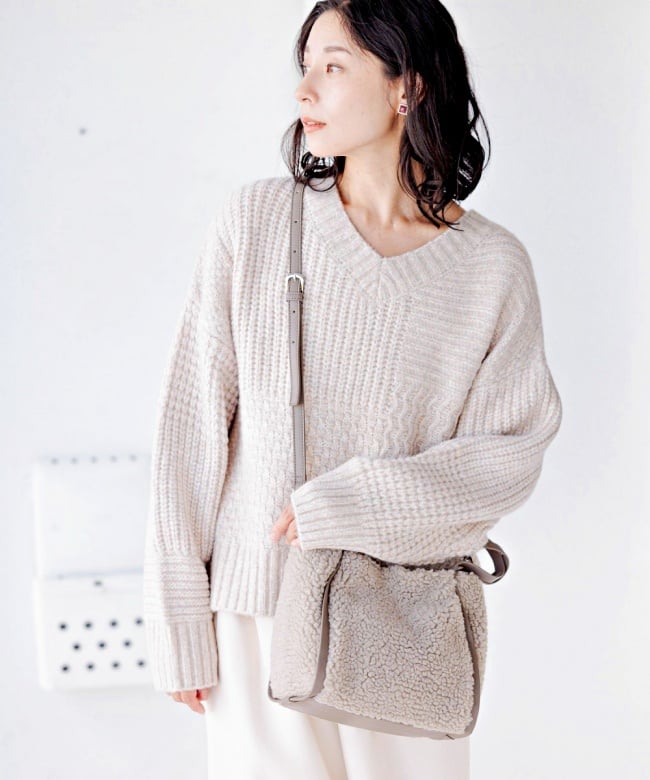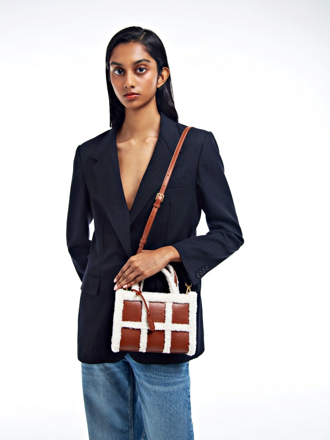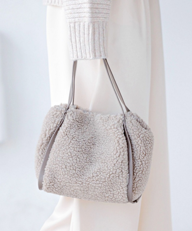 毛毛包也很有正式感!日本品牌green label relaxing家的羔羊毛毛包,帶點灰色調的溫柔燕麥米色,加上蓬鬆的仿皮草材質,療癒的毛海居然結合俐落感包型,同時搭配正流行的「竹節提把」,加上內建多個收納空間,當作通勤包袋去上班、開會完全是最加分的時髦神隊友。