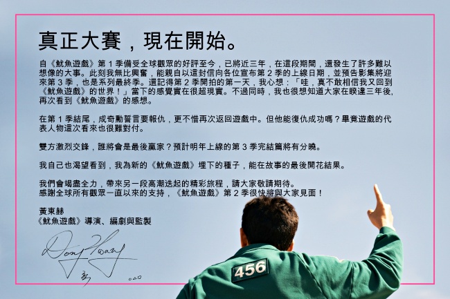導演黃東赫特別寫下長文公開心路歷程,他透露在開拍第2季的第一天就有種『回到《魷魚遊戲》世界的超現實感』,還特別預告了飾演主角成奇勳的「李政宰」將會面對很對付的遊戲代表人物,同時搶先公開第3季、也就是最後一季將在明年播出,最後贏家屆時分曉,天啊~妞編輯要等不急了!!!