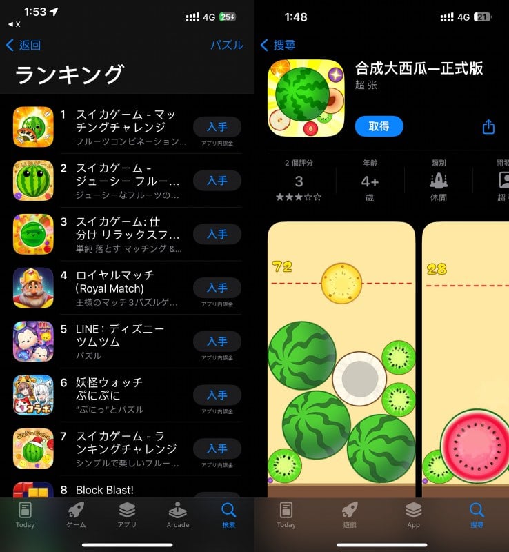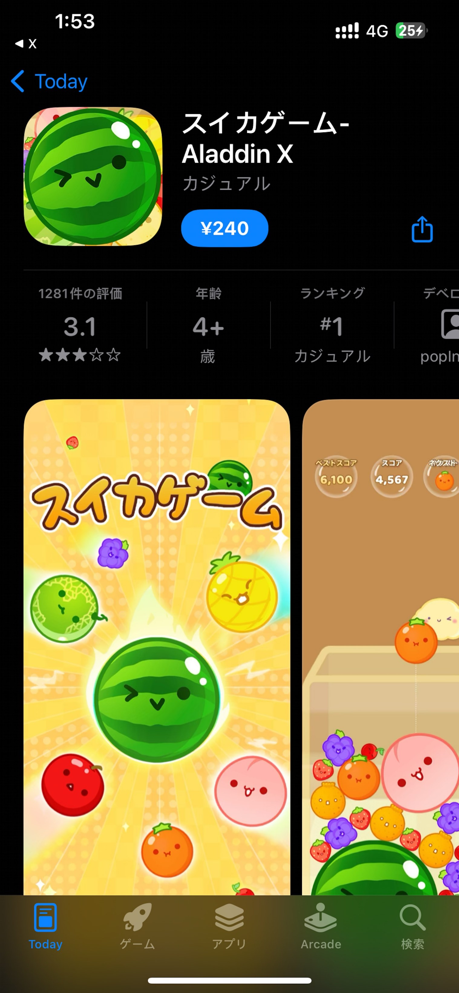 Aladdin X 官方在 2024 年終於把《西瓜遊戲》移植到 iOS 上,目前只有日本地區限定,買斷制240日圓,因此要下載就只能把 App Store 地區改到日本。
