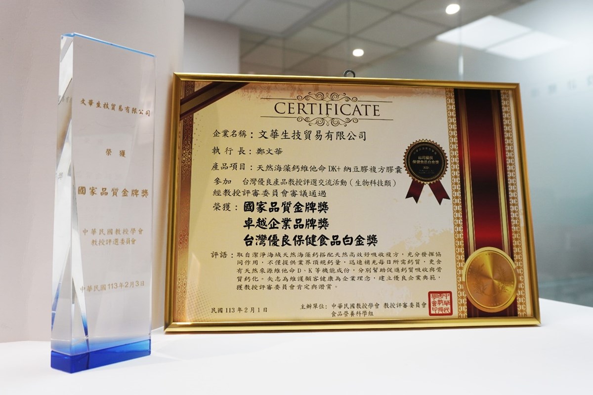 至今已成立十年,由百位以上不同領域教授組成的中華民國教授學會指出,本次獲獎的品項十分優秀:「晶亮視界金盞花葉黃素複方膠囊」以數十篇科學研究為背景打造,提供符合現代保健新趨勢的晶亮保養複方,展現在複方運用之前瞻性與創新的卓越品質。