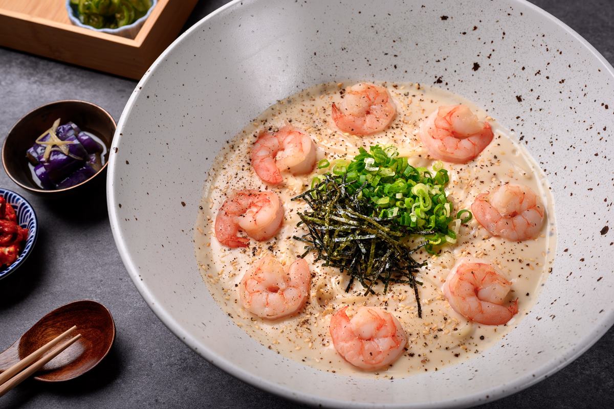 手工自製白醬,口感超級濃郁。蝦種選用鳳尾蝦,肉質香甜鮮美,以圓弧造型擺置於白醬湯頭之上,視覺感滿滿。(大碗360元,小碗240元)