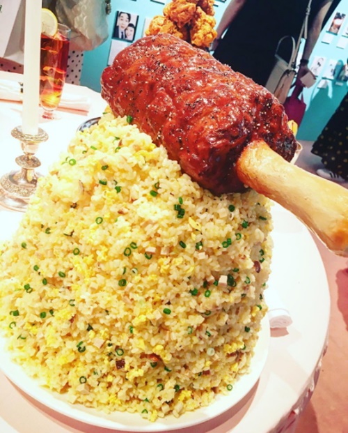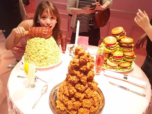 疊得跟山一樣高的炸蝦、超大盤炒飯外加一根特大支豬腳(?),還有成堆的炸雞和漢堡,原來這些就是渡邊直美平常愛吃的食物(驚)。而這一桌size異常的食物,也是整個展場熱門的拍照景點之一喔!