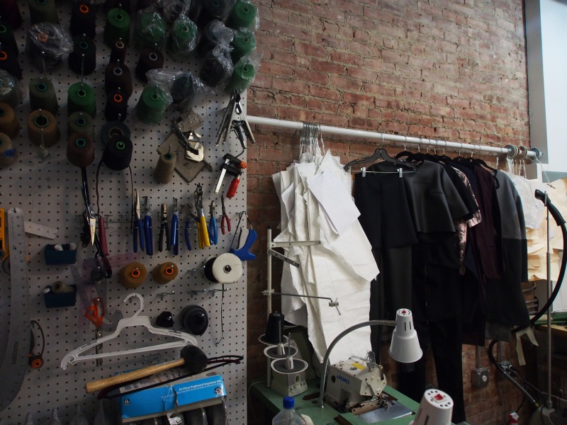 排列整齊的縫紉機、人偶、樣品、打版的圖紙、設計圖,咦~不是說時尚工作室都很亂嗎哈,怎麼拿~摸整齊(害我一開始進門活像是個鄉巴老入城吶,拿起相機準備拍攝最真實的一面)。這樣的反差,反而卻讓我更想挖出工作室的details嘿嘿嘿,眼神馬上閃到牆邊排排站的新系列…我非常喜歡她帶一點preppy學院風路線的設計,合身剪裁的上衣,搭配撞花色的片裙,裙擺上的銅釦耍一點點壞,感覺起來有點騷包school girl的味道,非傳統的乖乖牌~嗯,我愛!隨著跟她的交談越多,越覺得她沒有我一開始想像地那麼龜毛嘛,她說到來紐約成立品牌的血淚史,也說到為何要那麼堅持的理由。就因為一個人打理自己的工作室,偶爾才有intern來幫忙,所以必須要把環境打理地很有系統,才不至於需要花更多人力才能把一件事情做好(頗有道理)。雖然有點老套,但我在踏出她工作室門的那一刻,深刻地覺得認真的女人真有魅力啊。還有她手上的金箔指甲,也是讓我馬上想偷學著去弄弄看的細節。