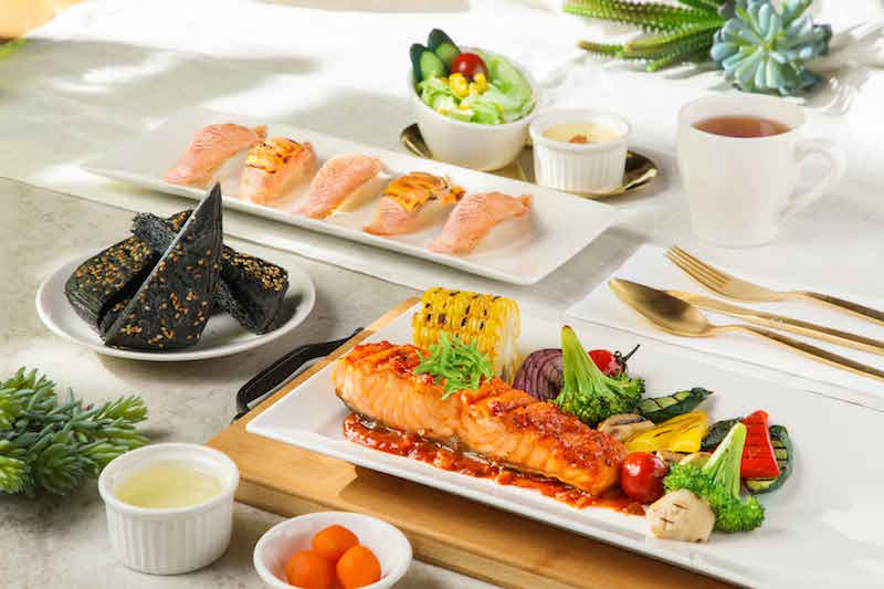 「炭烤鮭魚菲力佐陽光時蔬」(附竹炭麵包) 套餐NT.340