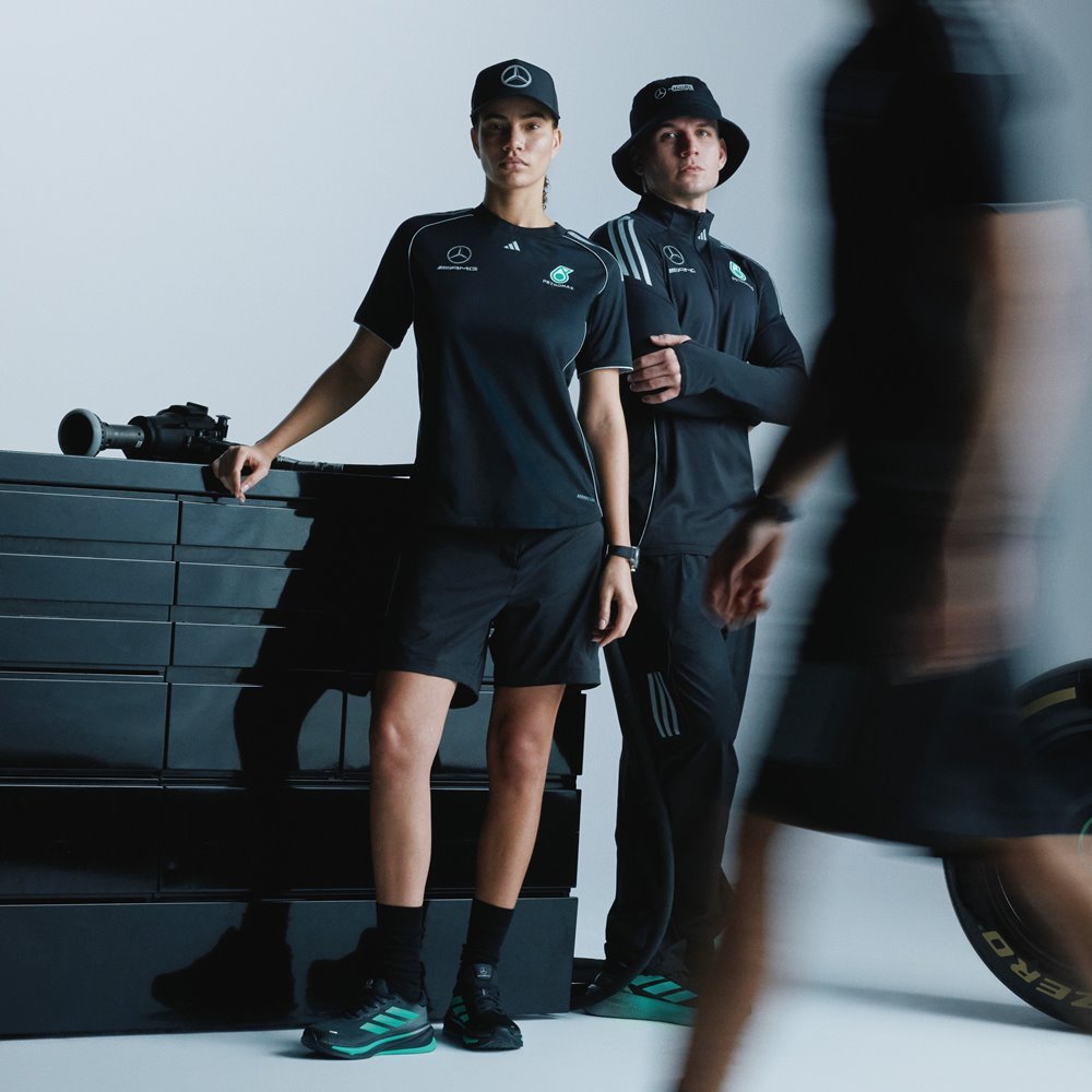 今年一月,adidas宣布成為Mercedes-AMG PETRONAS F1車隊官方長期合作夥伴,強勢登陸FORMULA 1® 賽道,象徵adidas正式重啟賽車運動支線,不但將持續為選手們提供專業比賽裝備,同時也為全球車迷帶來限定聯名系列。首波推出即帶來「Driver選手系列」、「Team技師系列」、「Fans車迷系列」等服飾及配件,除了配上adidas經典LOGO與MERCEDES-BENZ三芒星外,更採用車隊標誌性銀箭配色-黑銀配薄荷綠色,延續經典傳統。