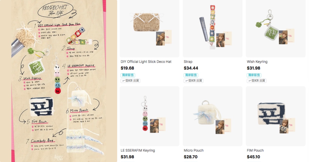 小櫻花的個人針織品牌名為「KKUROCHET」,第一波一口氣販賣7個品牌,從收納小包到配件小物,都採用溫柔清新的色系加上蝴蝶結、可愛圖樣以及獨特的「韓文字」編織,像是寫著「祈願」韓文的幸運草吊飾、花朵針織裝飾帶、丸子鑰匙圈吊飾,可愛指數破表,每一項都充滿小櫻花的風格。