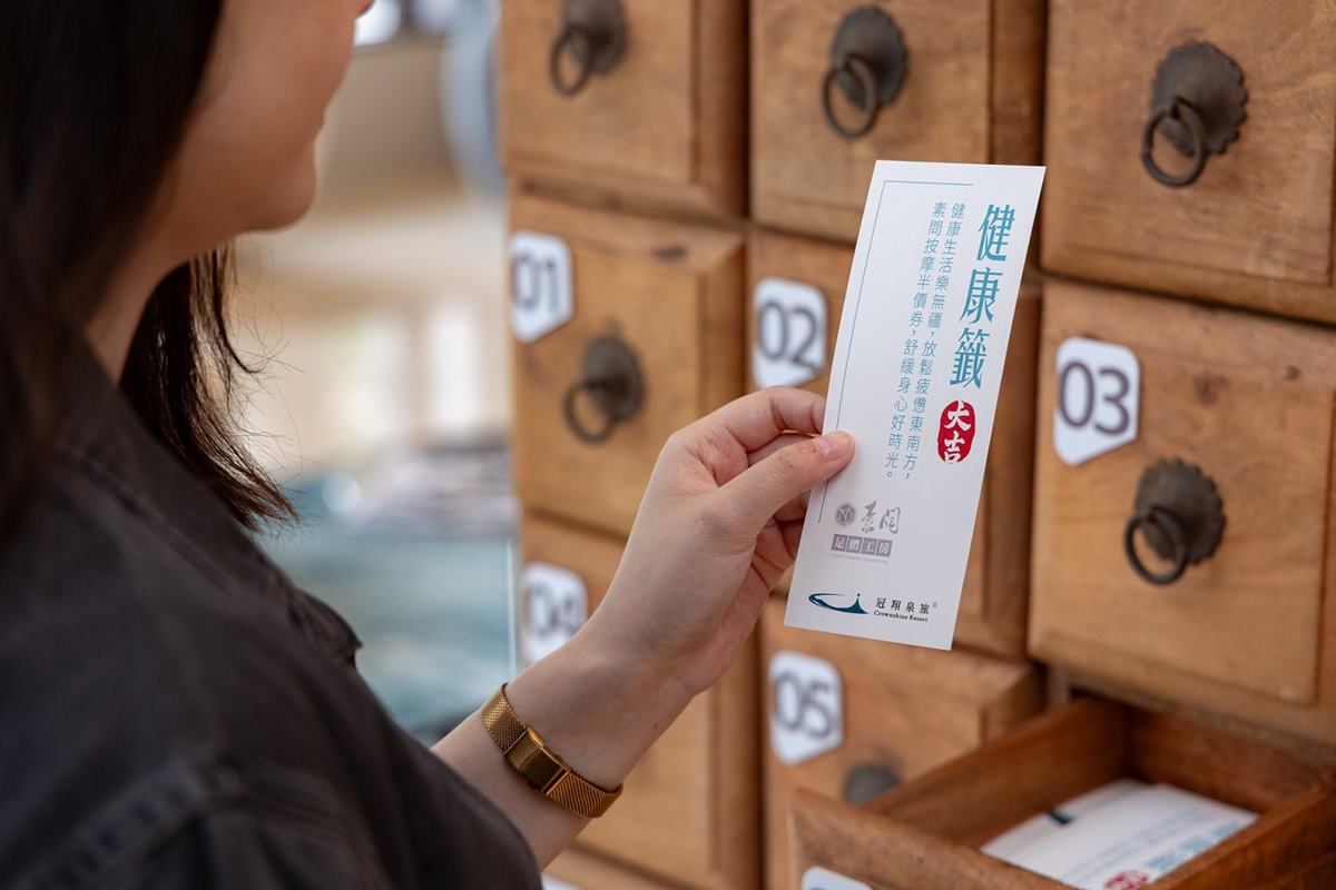 「療癒三籤」贈品對應不同主題,例如健康籤有機會獲得宜蘭百年老店的漢方足浴包,為旅人入住時增添互動驚喜