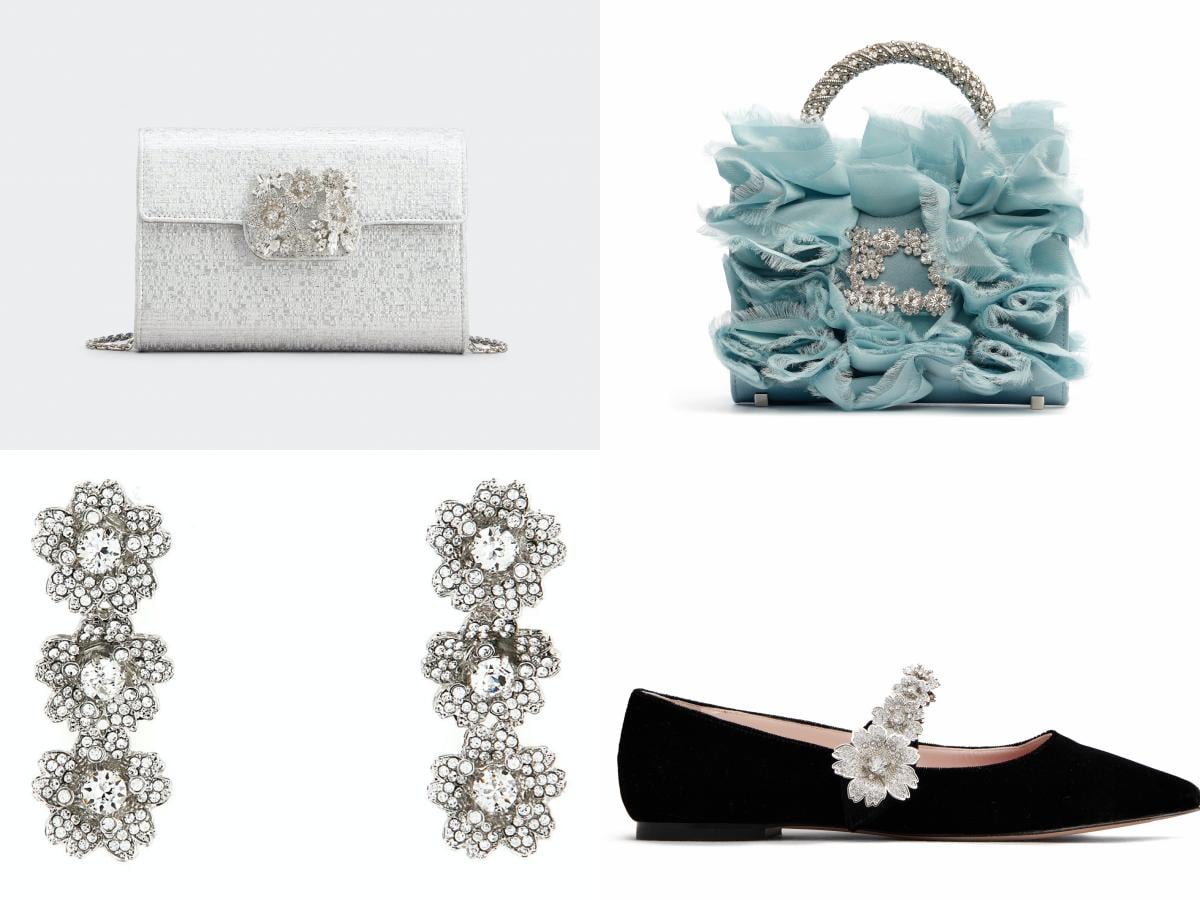 、Flower Jewel 花朵鑽扣耳環 NT.26,000、Bouquet 花朵鑽扣平底鞋 NT.79,900