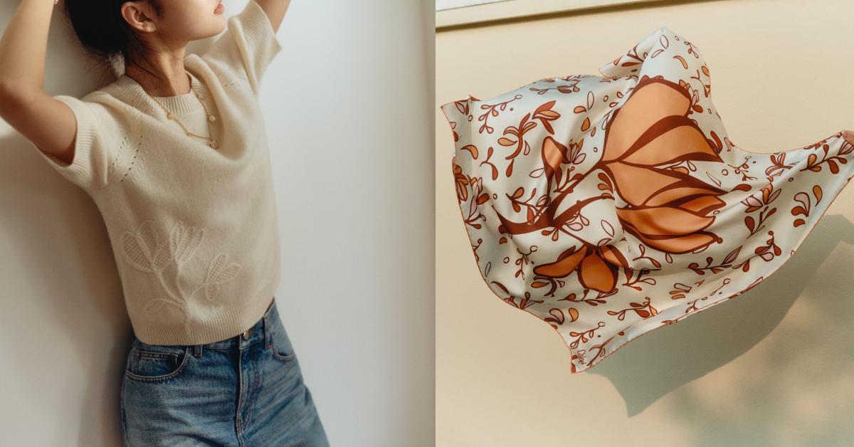 、農曆年系列木蘭花白色針織上衣 NT.35,700、農曆年系列木蘭花橘米雙色絲巾 NT.7,000