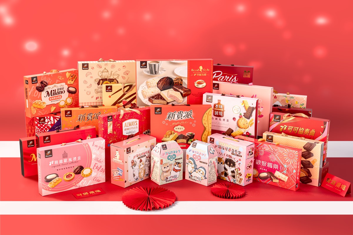 過年想要吃少負擔與兼顧健康的消費者,則有二種款式可挑選,其一為本味誠現綜合禮盒,嚴選優質用料的美味,擁有慈悅最高等級100%無添加標章認證;其二的歐維氏頂級醇黑巧克力禮盒,主打嚴選世界頂級可可豆產地,融入珍貴可可脂,以【國際級五滾輪工藝】與【世界級調溫技術】打造口感細緻滑順、入口即化的優質醇黑巧克力,也榮獲歐盟A.A.無添加認證,慈悅雙潔淨標章認證雙認證,可讓年節吃的開心也能健康享受。77也將品牌經典的新貴派、巧菲斯、蜜蘭諾組成77皇家春禧禮盒,六款不同風味讓全家大小可以一盒享用到豐富多樣經典餅乾,體面大方的設計是禮盒中的長年銷售冠軍款。77推出多達22款禮盒提供年節送禮,要讓龍年送出滿滿的心意。