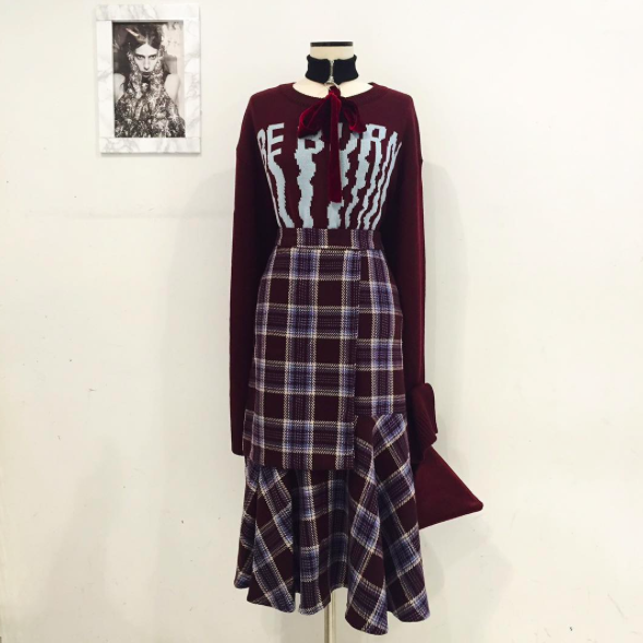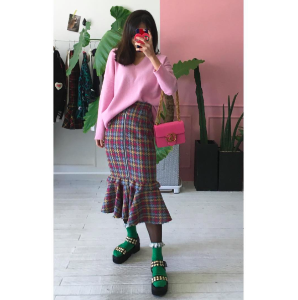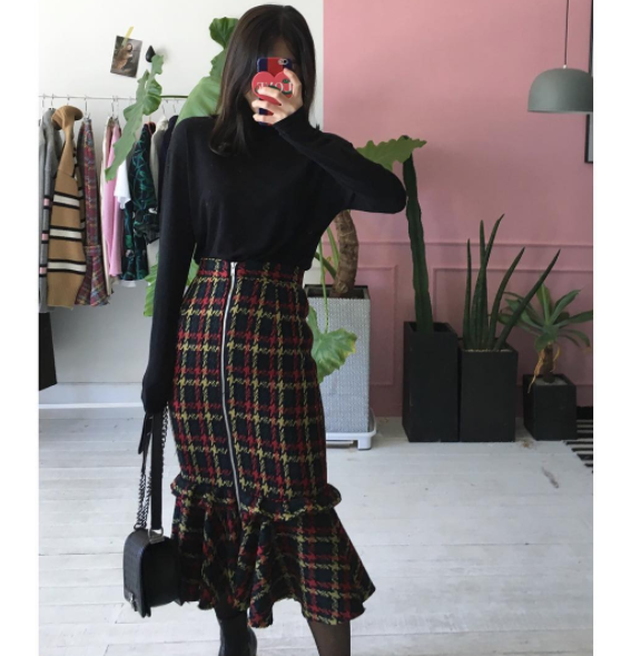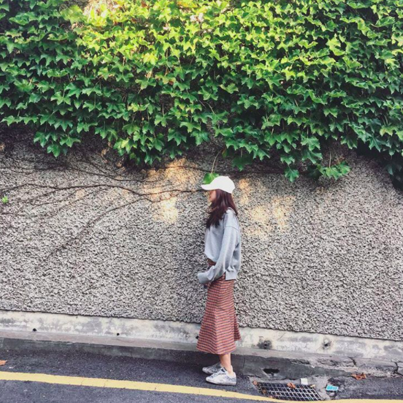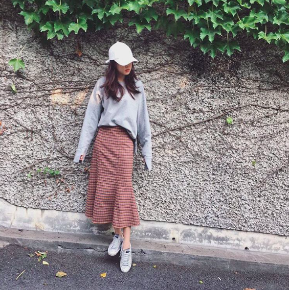 這套由Apink成員孫娜恩示範,用素色棉T、棒球帽、球鞋這些基本單品,再搭上磚紅格紋的美人魚裙,看似很低調的穿搭,卻因為一件裙子抓住眾人的目光,並且魚尾裙上窄下寬的設計,也凸顯了娜恩的好身材。
