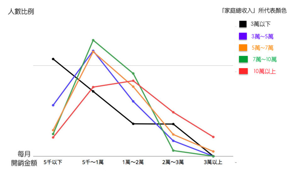 雖然家庭收入多寡確實會影響育兒花費,但就比例上來看,大多數的家庭每個月還是會花5千~1萬元在小孩身上;家庭收入低於3萬的家庭,每個月則會控制在5千元以下育兒;少部分收入超過7萬的家庭,有餘力每個月花3萬塊以上育兒,而從他們的開銷項目來看,也可以看出他們花很多錢在托嬰、保母、小孩的才藝課上。