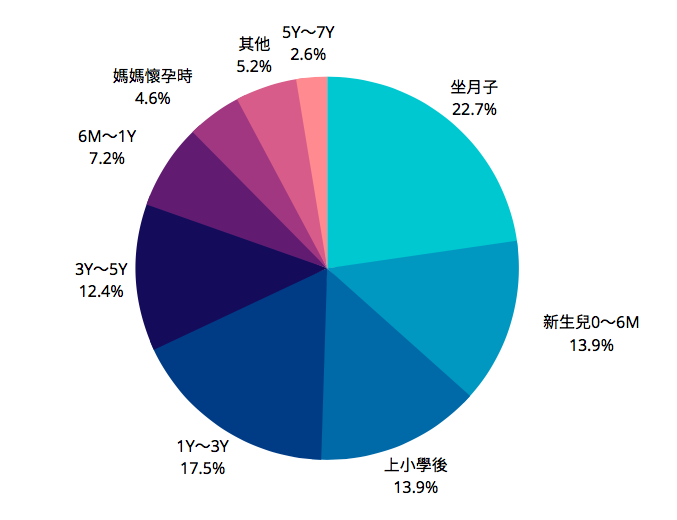 Top1.坐月子(22.7%)、Top2.1Y~3Y(17.5%)、Top3.新生兒0~6M(13.9%)、上小學後(13.9%)、Top4.3Y~5Y(12.4%)、Top5.6M~1Y(7.2%)、Top6.媽媽懷孕時(4.6%)、Top7.其他(5.2%)、Top8.5Y~ 7Y(2.6%)