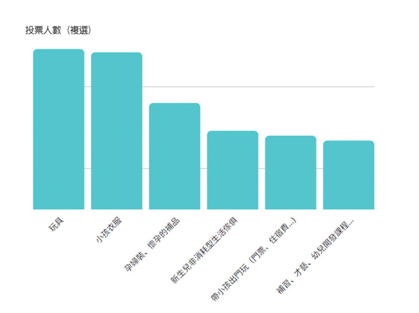 Top1.玩具、Top2.小孩衣服、Top3.孕婦裝、Top4.非消耗型嬰兒生活傢俱、Top5.帶小孩出門玩(門票、住宿費...)、Top6.補習、才藝、幼兒開發課程
