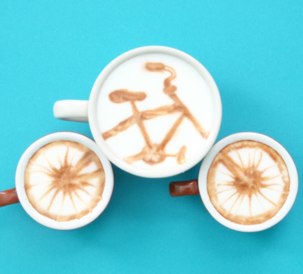 一杯咖啡杯不夠創作,只好把好幾杯合在一起了!Homer遙望著他的甜甜圈(Homer太可愛啦),這個辛普森迷一定會喜歡啊~還有用三杯拉花的延伸畫出一台腳踏車也太有才了吧!會不會以後的拉花範圍越來越廣,需要用好幾十杯畫出來?