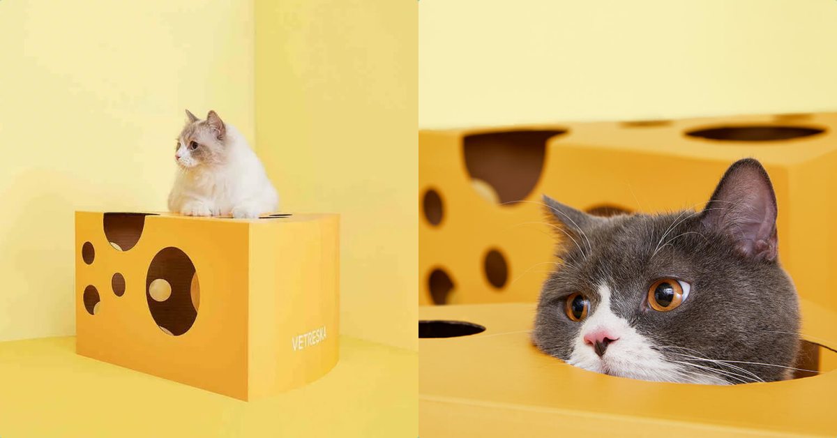「芝士起司,就是力量!」由Vetreska推出的「起司貓抓板」有著超吸睛的外型!還原起司的多孔設計,讓貓咪可以在裡面玩樂或睡覺。比較要注意的是貓抓板的頂端紙板偏薄,太重的貓咪可能會塌陷(妞編輯的貓5.5公斤,有微塌陷痕跡),而內部則可容納一隻7公斤的貓。經實測,妞編輯的貓很愛躲在裡面(暗暗的),每次下班回家都會看到兩隻貓輪流待在裡面,到底是有多愛?(還是你們其實是老鼠XD)