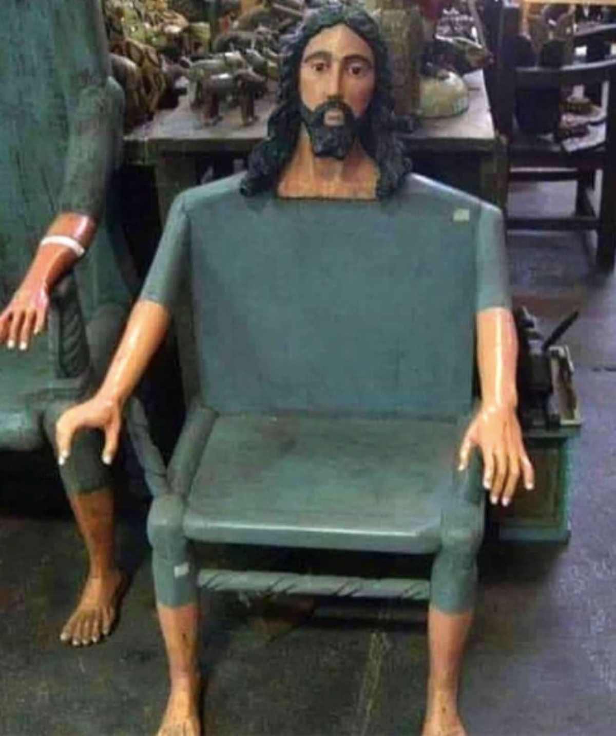 耶穌完整身型的單人座椅,除了椅背上有耶穌的頭之外,扶手與椅腳分別也是耶穌的手跟腳,先不管坐起來舒不舒服,這張椅子坐了真的不會大不敬嗎?