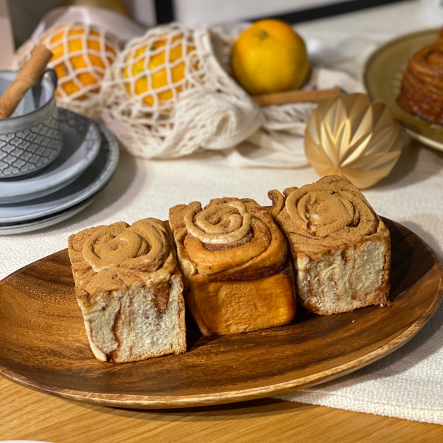 註:若烤箱無法設定溫度,較安全且均勻的加溫,可先加肉桂捲橫剖切半,噴水回烤3分鐘