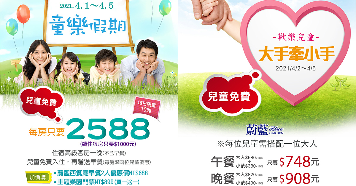 劍湖山渡假大飯店蔚藍西餐廳也推出兒童節優惠活動,4月2日至4月5日推出「大手牽小手」專案活動,大人帶12歲以下小朋友用餐,招待小朋友免費。兒童連假期間「童樂假期」方案,兒童入住免費,兩大兩小入住高級客房只要2588元(不含早餐),再加贈兩客兒童免費早餐,大人加價購早餐兩人只要688元,續住每房只要1000元,更多優惠內容,詳情請洽劍湖山渡假大飯店官網http://janfusun.com.tw/tw/html/news/index.php?unid=3&unid=3。