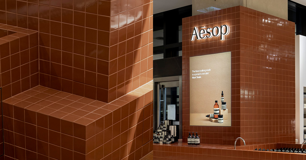 Aesop設計團隊向台灣傳統建材與台南在地建築致敬,店鋪設計使用大量台灣在地手工製造的紅磚瓦,每一片皆由手工製作,顏色皆有所不同,但大小相同皆為100mm正方形。在地面上基於實用性以及安全的考量使用霧面材質,店鋪內其他牆面則使用亮面磚紅磁磚,創造材質與視覺上的層次感。