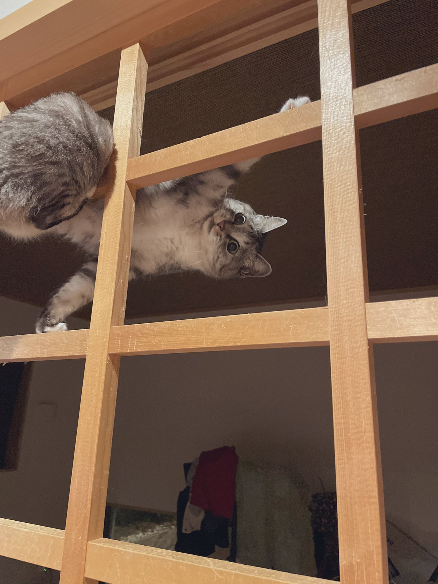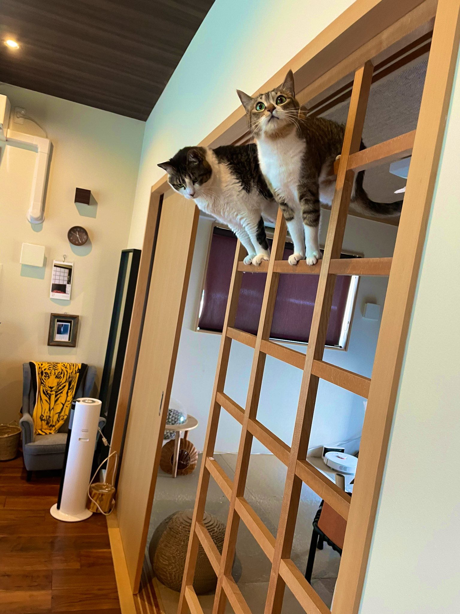 妞妞們看照片可以猜到結果了嗎?主人直接投降將拉門的紙全部拆掉,無可奈何地只好放棄整修。站在高人一等的拉門最上層,似乎完全能滿足兩隻貓咪眺望遠方的需求,更可以方便牠們直接從底下通行,不需要繞道而行,難怪貓咪們會拼命地搞破壞了!