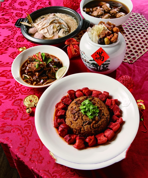 義大天悅飯店「福虎賀歲年菜外帶」,包括中西合璧的「極汁戰斧豬排」、巧用瑪卡藥材入菜的「皇菇鮑魚烏骨雞」,還有工序繁瑣的「蓋子頭」等,要以全新風貌讓消費者在新的一年萬象更新,除了可單點,亦有包含迎春五福盤前菜、金蟲草干貝翅盅、箱烤路易士排、蒜香海大蝦、雙菇烏蔘黃金鮑、鮮露海石斑、瑤柱皇菇扒芽白、金沙鰻片米糕、瑪卡燉烏骨雞、鴛鴦甜八寶共10道佳餚的富貴套組!