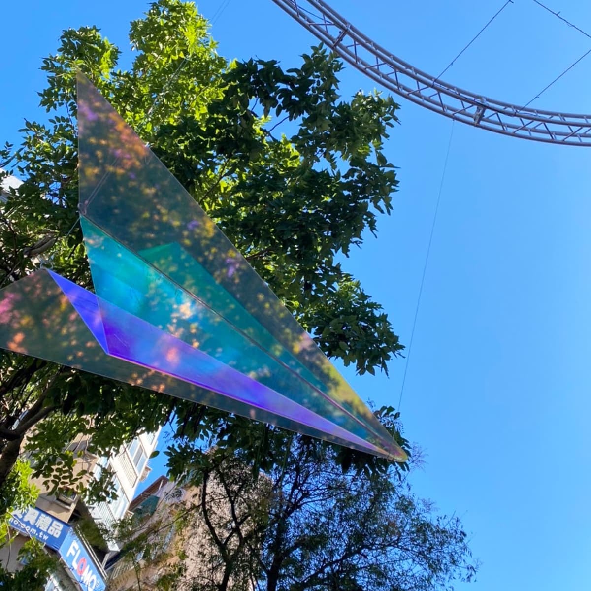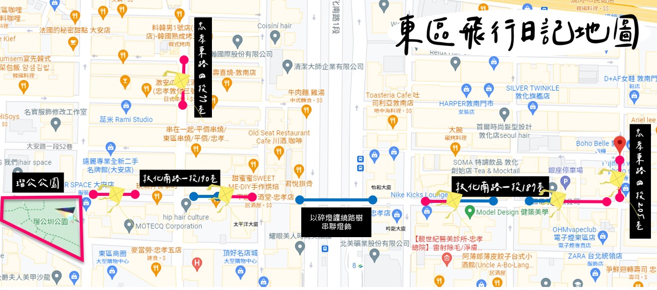 「東區飛行日記」遍佈整個東區最繁華的地段,從忠孝復興站到忠孝敦化站之間通通有,妞妞們如果搭捷運來,就可以從頂好廣場出口的瑠公公園,一路往敦化南路一段190巷開逛,白天時陽光透過半透明的紙飛機,那粉色的光暈同樣閃耀動人,不管白天、晚上各有不同面貌,什麼時刻都超好拍啦。