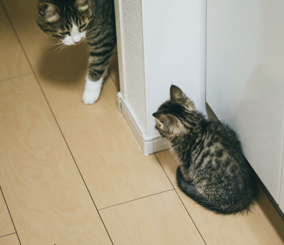 小貓初來乍到時會經過一段適應期,而在適應期後就會展露出牠無畏的本性,開始追逐、探索著周邊的事物,而大貓作為少數「會動的生物」當然更能引發小貓的好奇心。在精力旺盛的小朋友時期,貓妹妹常常會尾隨哥哥,想要對方跟自己一起玩耍,伸爪爪時下手就會比較不知輕重,讓旁觀的鏟屎官感到:「小貓是在挑釁嗎?」但其實貓妹妹只是很想跟哥哥玩,還沒拿捏好分寸啦!