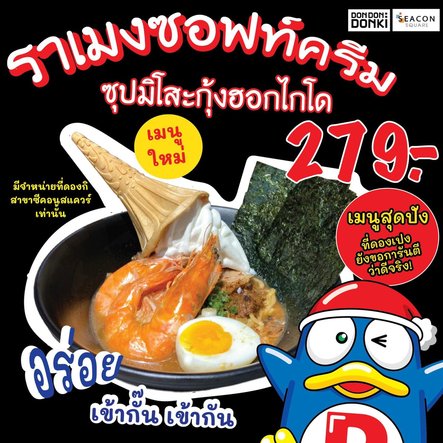 「驚安殿堂 唐吉訶德」身為日本來的店家,怎麼可以錯過這次的霜淇淋風潮呢?泰國的Seacon Square百貨內的唐吉訶德,推出了自家的拉麵口味,利用北海道的蝦味增去搭配香草奶油冰淇淋,香甜順滑的口感,搭配蝦的鮮味真的大推呀!