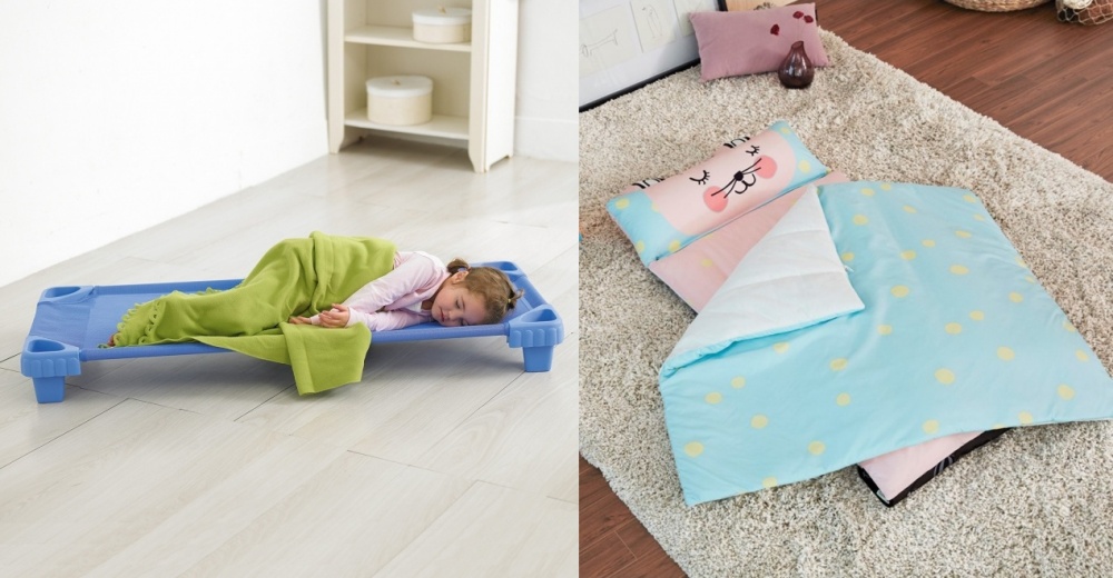 有些園所午休時是睡地板,有些則會用類似左圖的地板床當作床,如果是直接睡地板最好選用枕頭和睡墊一體成型式的睡袋,也避免跟其他人的寢具搞混。如果有用地板床,就可以只帶枕頭跟被子,但因為孩子要自己收被子,所以款式盡量用一樣的或同色系,避免孩子難整理哦!如果目前孩子還沒辦法自己睡覺,可以多帶一個安撫玩偶或小被被讓孩子午休時抱著~