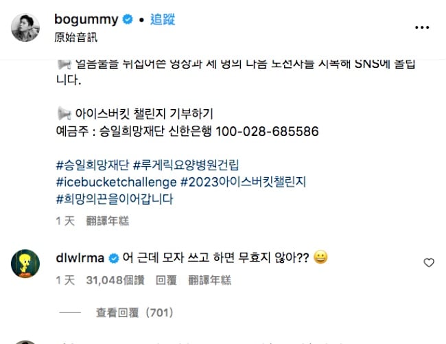 另一位被指名挑戰的男神「朴寶劍」,當然也在時限內完成挑戰,他穿著一件簡單的黑色上衣,自己舉起冰桶淋下,積極做公益的模樣被讚爆,不過卻意外出現「質疑聲浪」!?留言區驚見同時做完冰桶挑戰的IU,一針見血表示:「但是戴著帽子挑戰的話,不是應該無效嗎?」一句神回應引爆網友爆笑,也顯示兩人好交情。(該不會寶劍得再拍一支吧哈哈哈)