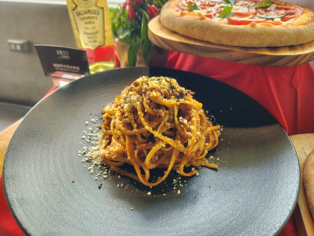 主廚推薦的「波隆那番茄肉醬細扁麵」是晶華酒店中庭餐廳azie的人氣料理,使用牛絞肉、番茄醬熬煮醬汁,期間加入具有豐富膠質的切丁牛尾、義大利培根火腿及時蔬,層層工法共需花上4小時的慢火細燉,讓口感能更加層次分明,拌炒細扁麵後肉香不減,酸香滋味超好吃。
