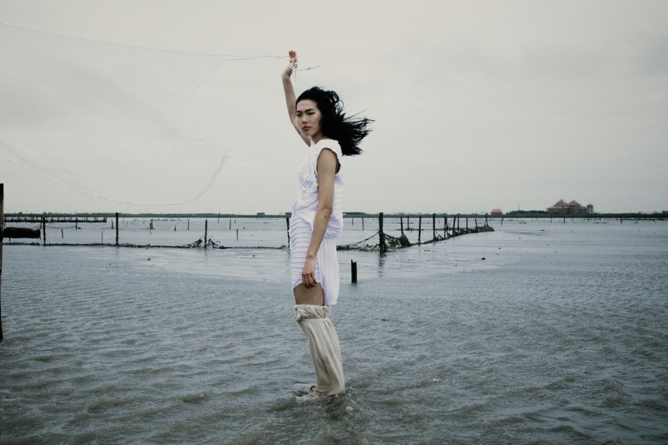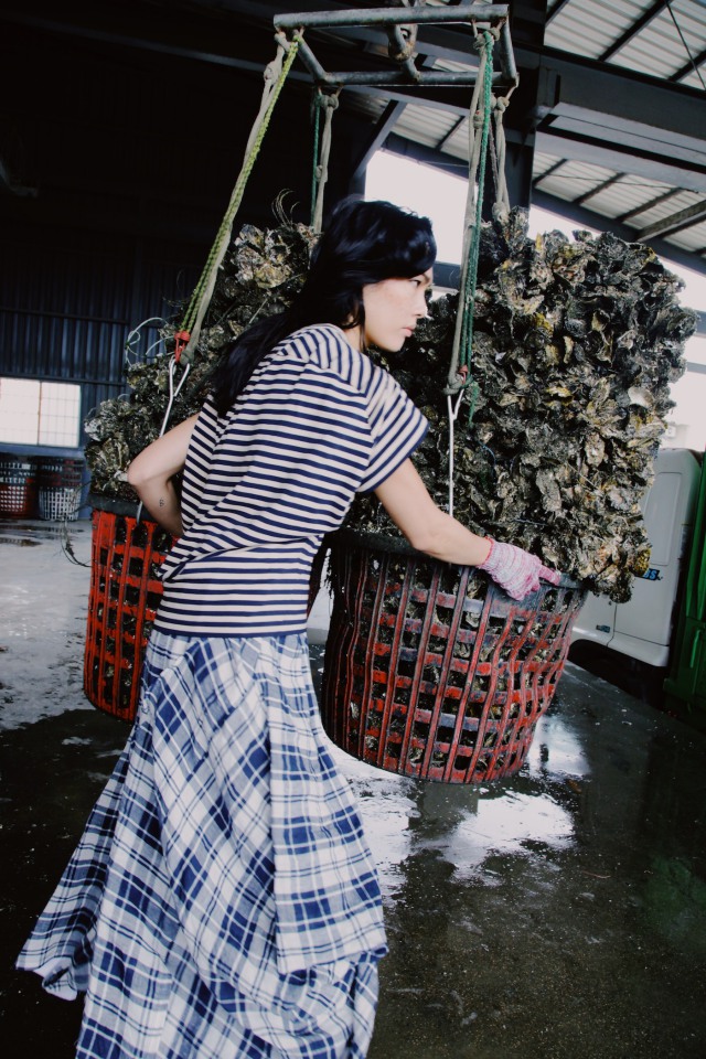 想重現民國50年代的耕蚵景象,演繹台灣「耕蚵」精神,這和CHARINYEH服裝的結合上覺得最契合的地方是?「衣服後片大於前片的結構設計是這一季的重點之一:發想自”耕作的姿勢”,以此彎腰結構概念去傳遞台灣人能屈能伸的精神;圓順蚵型:在耕蚵這個題材中,有感大自然的奇蹟奧妙,每一個生命都是如此的相像卻又不同。將圓順、不規則巧完於服裝結構上,除了反刻畫蚵之外,也借由圓順柔表徵台灣傳統女性的柔順性格。蚵,外堅內軟,更是我們想表達台灣人堅韌的外表下有著柔軟的一顆心。」