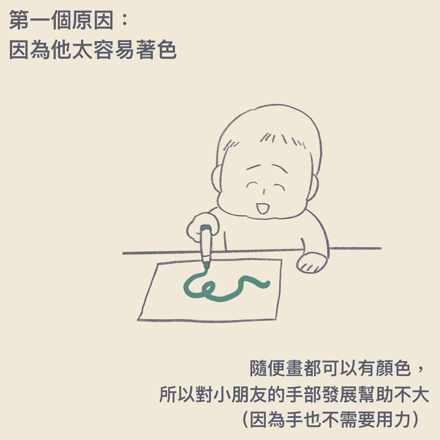 彩色筆的特色就是使用上非常便利,只需要很輕的力氣就可以畫出飽滿的顏色,但這是優點也是致命的缺點因學齡前的孩子需要更多的肌肉訓練,畫畫能促進手部小肌肉成長並訓練孩子控制手指、手腕的力道,但彩色筆只要拿起來隨便撇就會有很深的顏色,孩子也就用不到手部肌肉了!