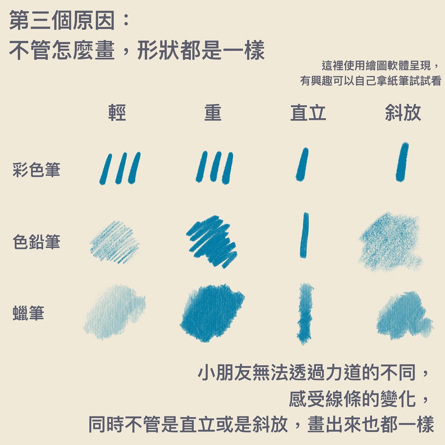 就如同草雞老師示範的,彩色筆不管橫著塗、豎著塗、輕塗、重塗,畫出來的樣子都是一樣的,非常單一,但蠟筆、色鉛筆卻可以利用不同的握筆角度、力道輕重來呈現不一樣的筆觸,讓孩子在繪畫的過程中有更多選擇與發現。